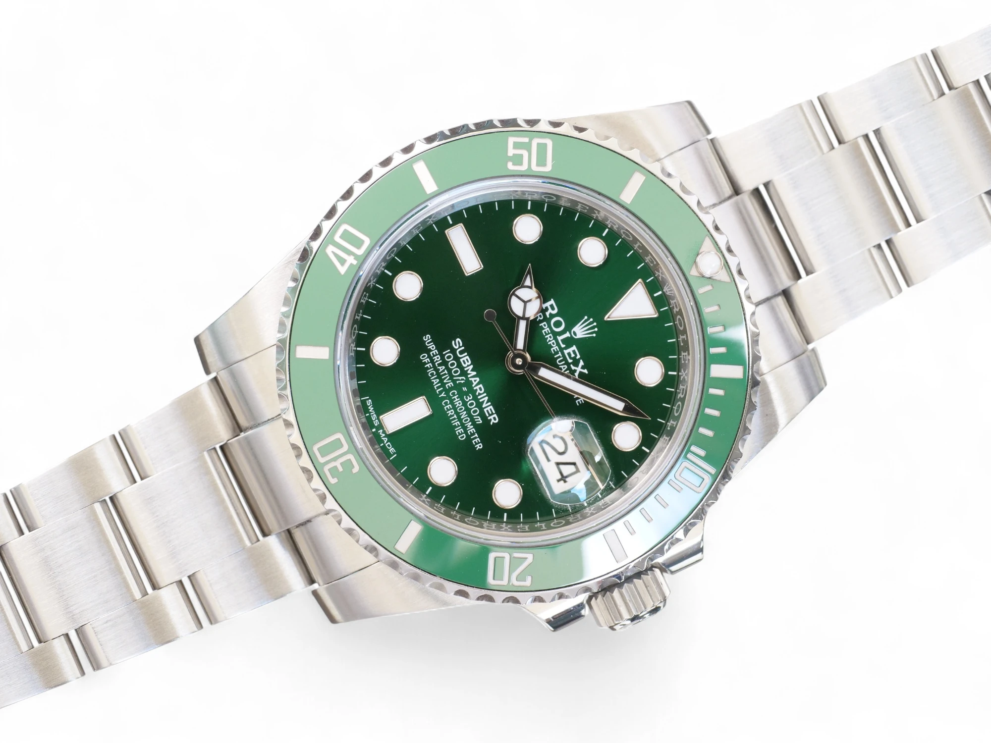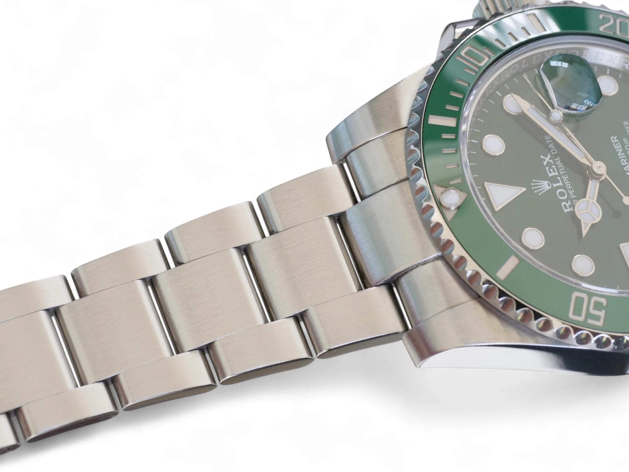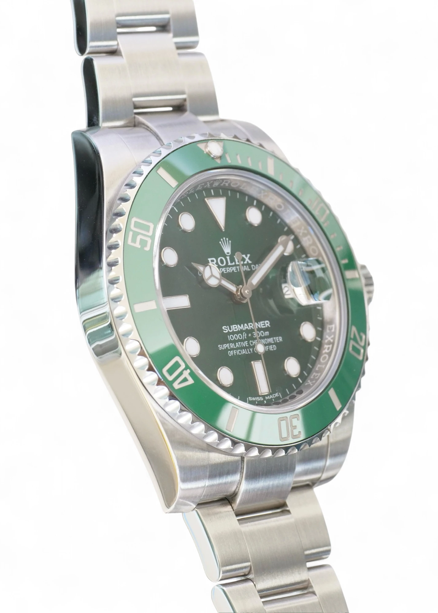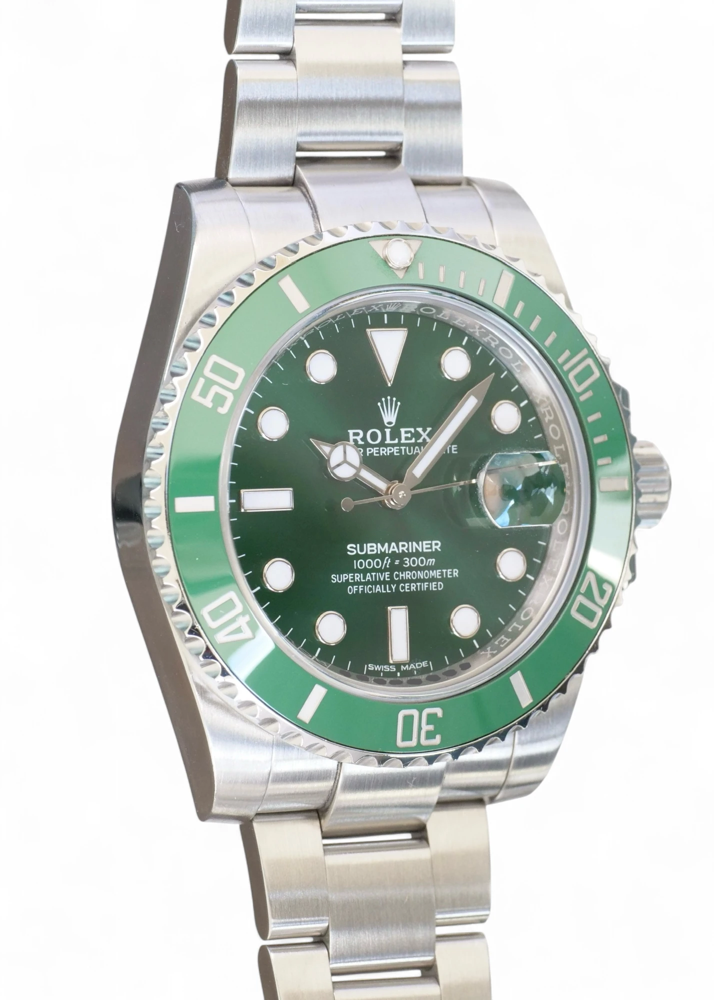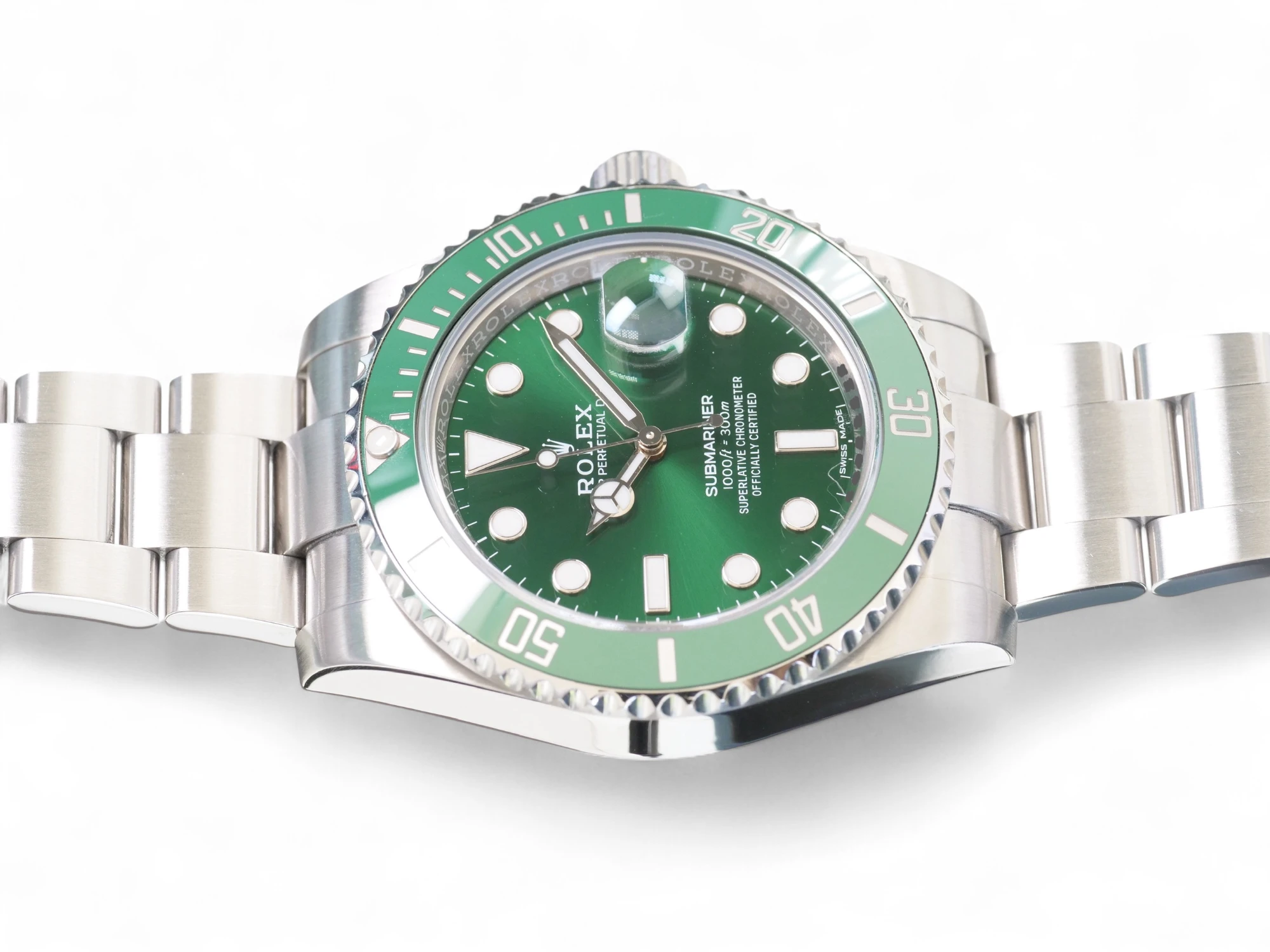Rolex Submariner Date Hulk model 116610LV, a beautiful, long discontinued and a very collectible Rolex in a spectacular green sunburst dial, and green ceramic bezel – the only all-stainless-steel Submariner in a colored, and then a green dial ever produced in over seven decades.