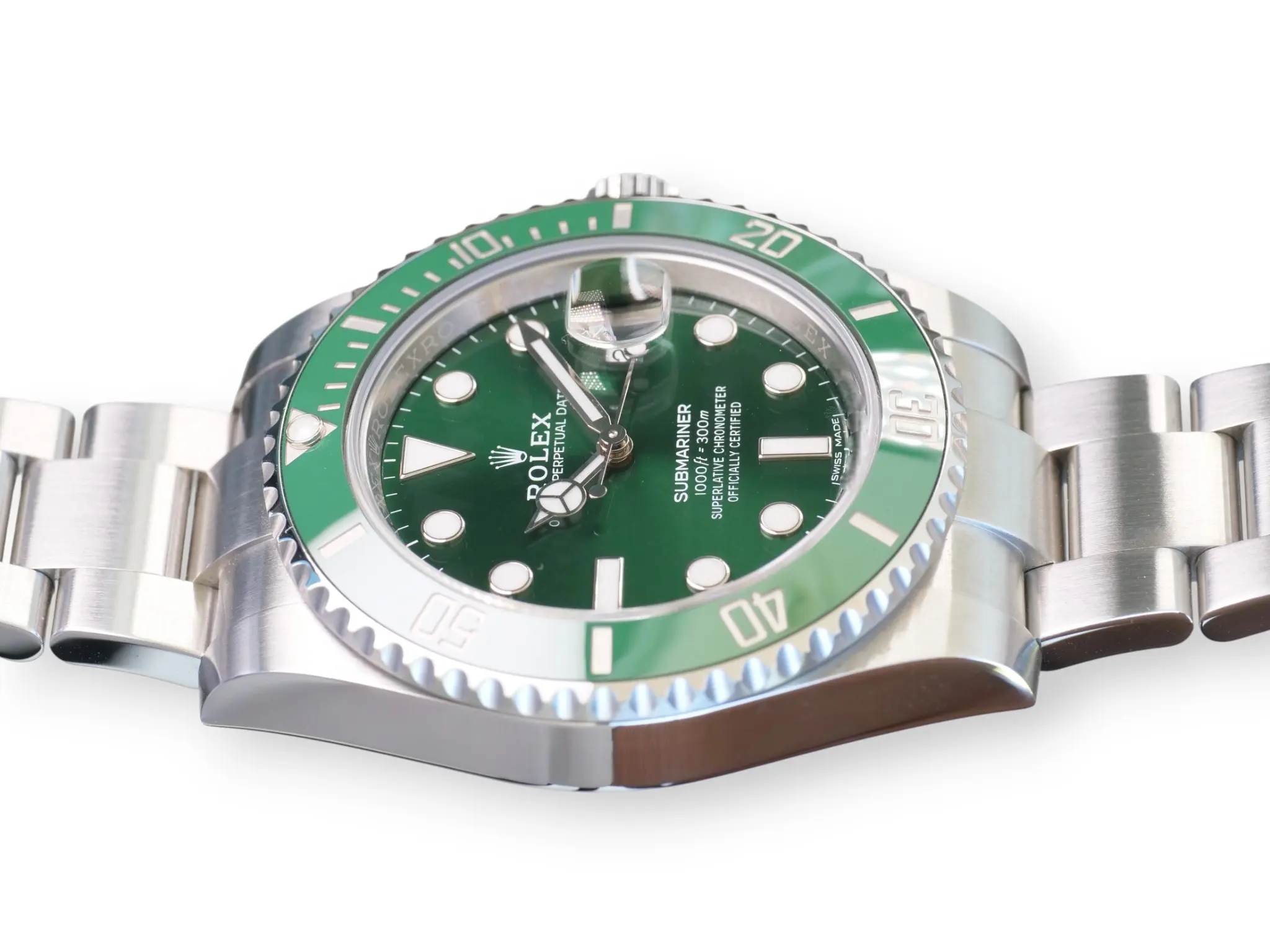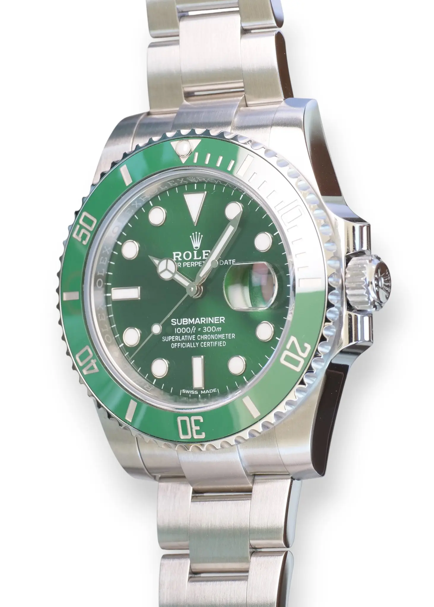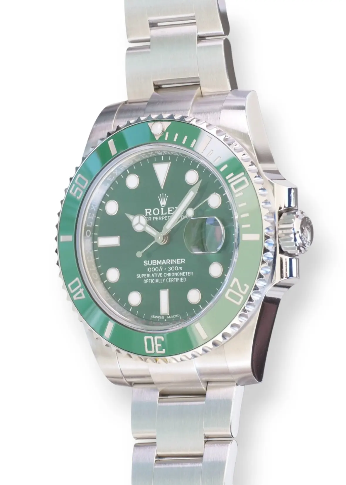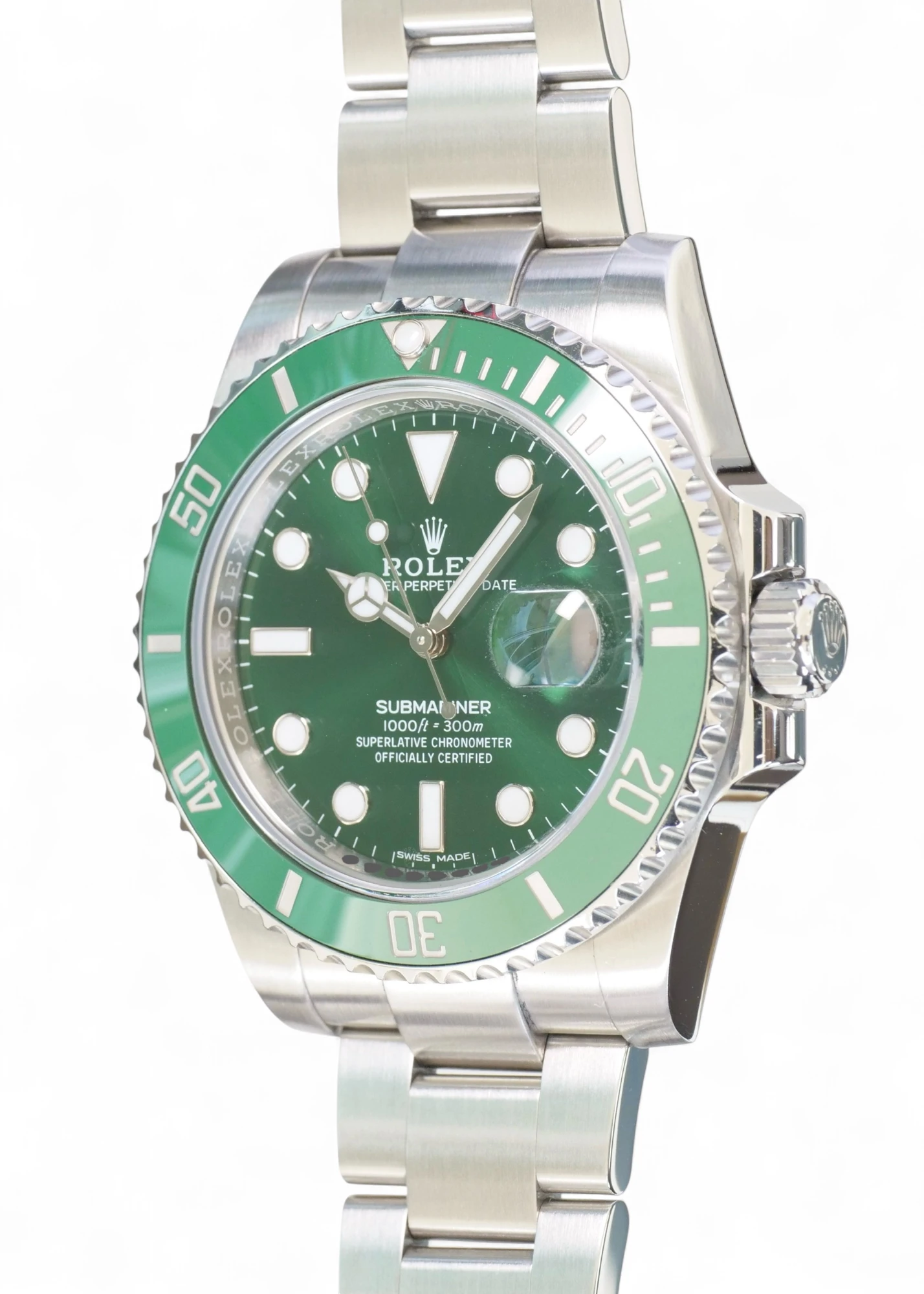 Rolex Submariner Date Hulk model 116610LV, a beautiful, long discontinued and a very collectible Rolex in a spectacular green sunburst dial, and green ceramic bezel – the only all-stainless-steel Submariner in a colored, and then a green dial ever produced in over seven decades.