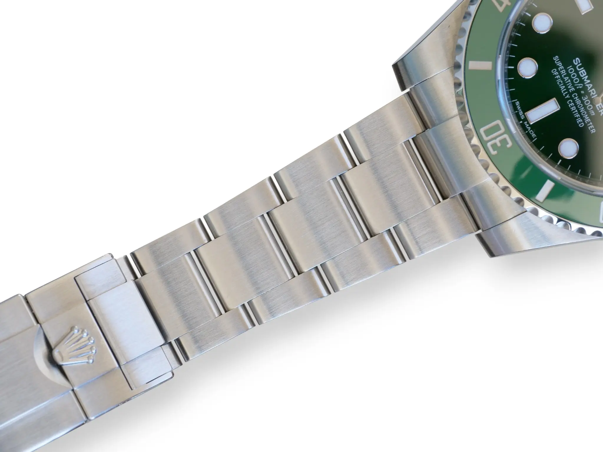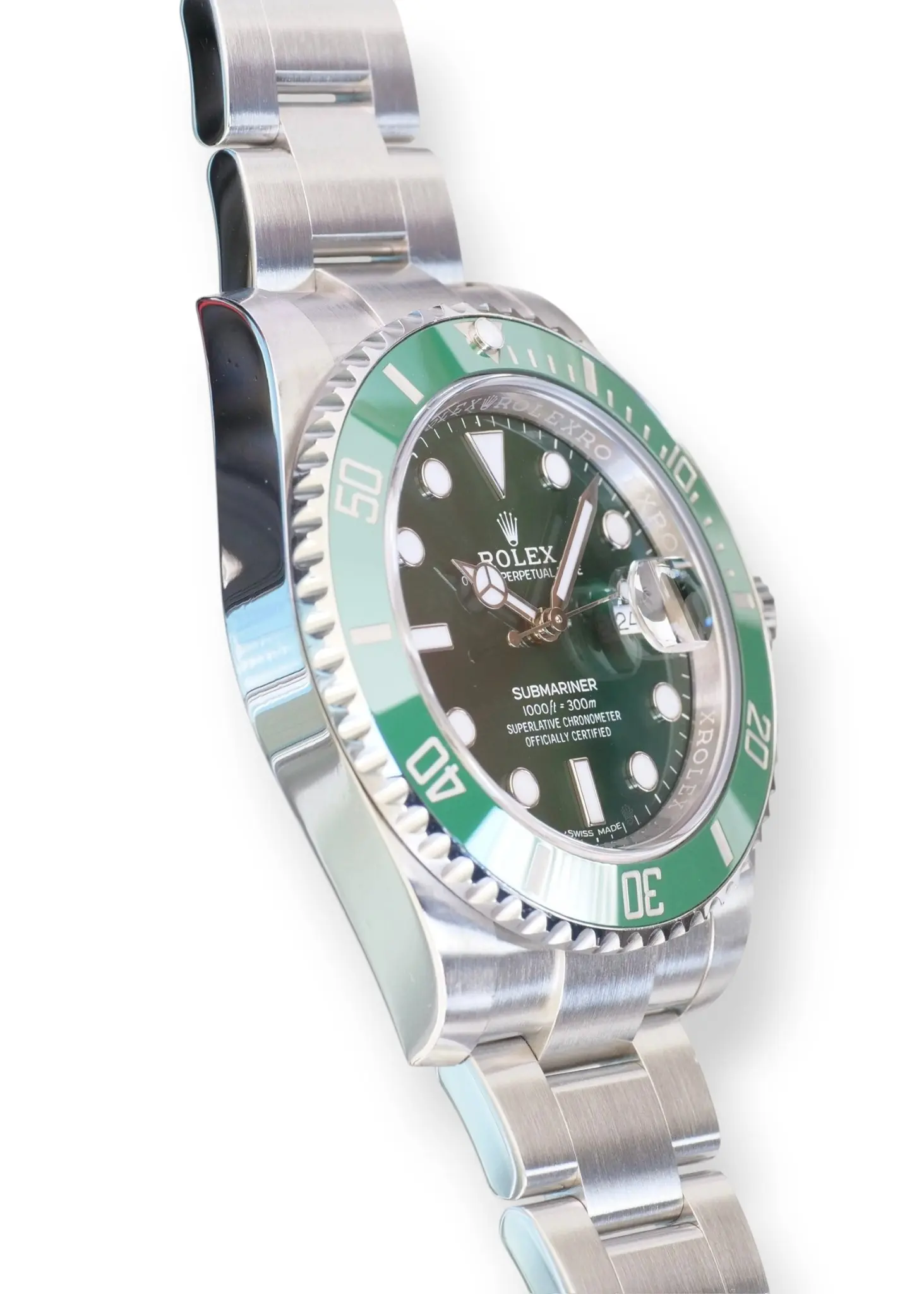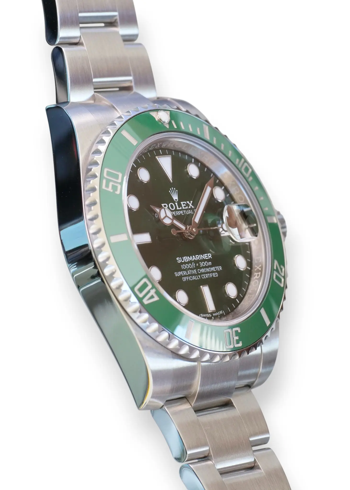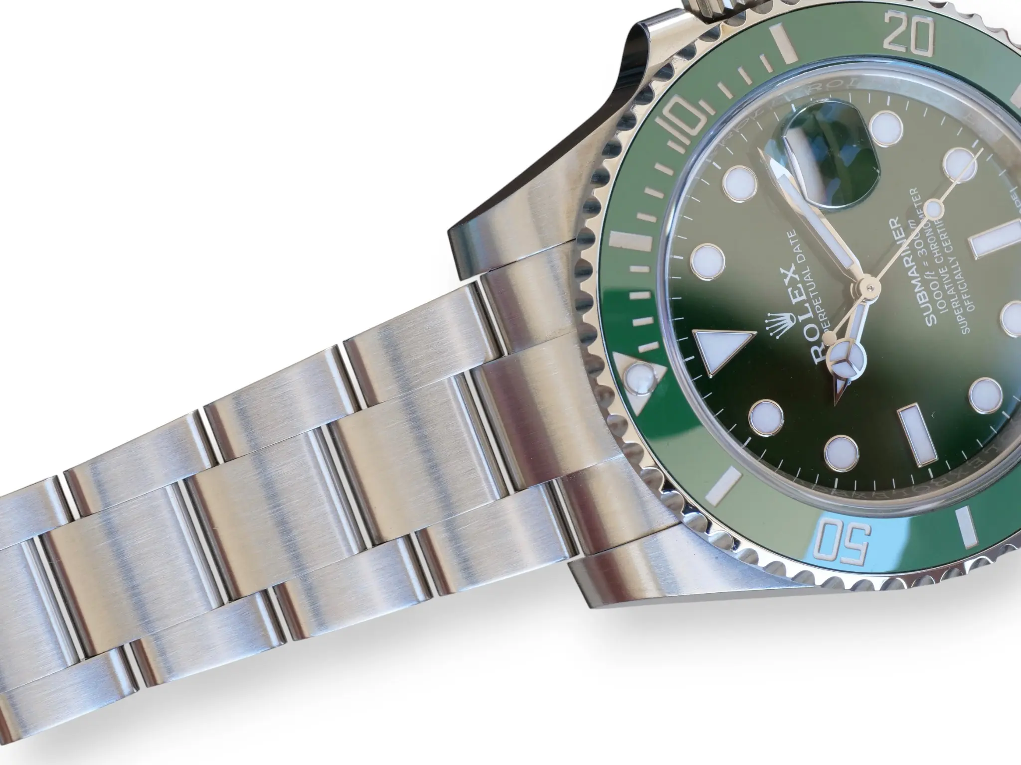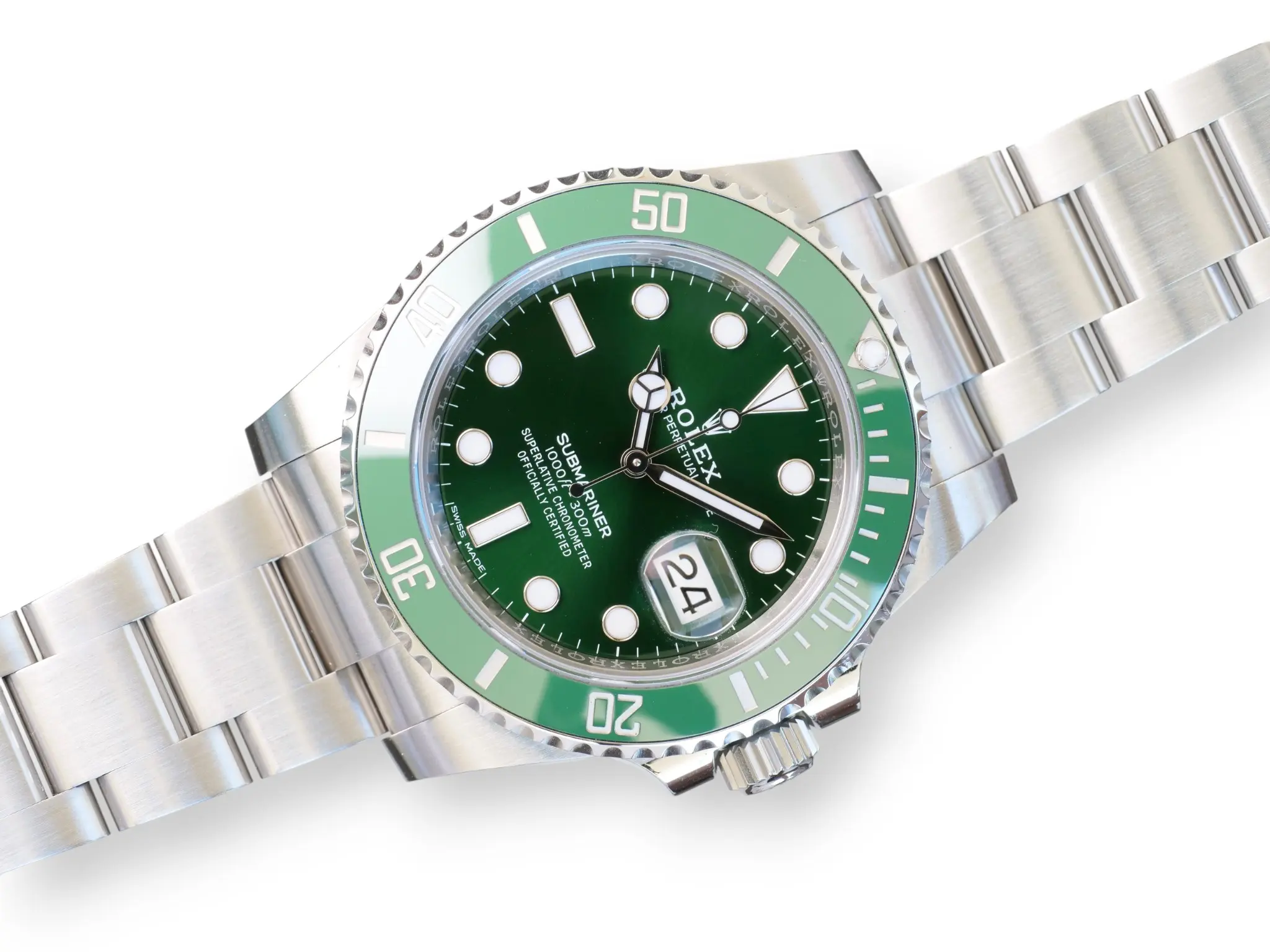 Rolex Submariner Date Hulk model 116610LV, a beautiful, long discontinued and a very collectible Rolex in a spectacular green sunburst dial, and green ceramic bezel – the only all-stainless-steel Submariner in a colored, and then a green dial ever produced in over seven decades.