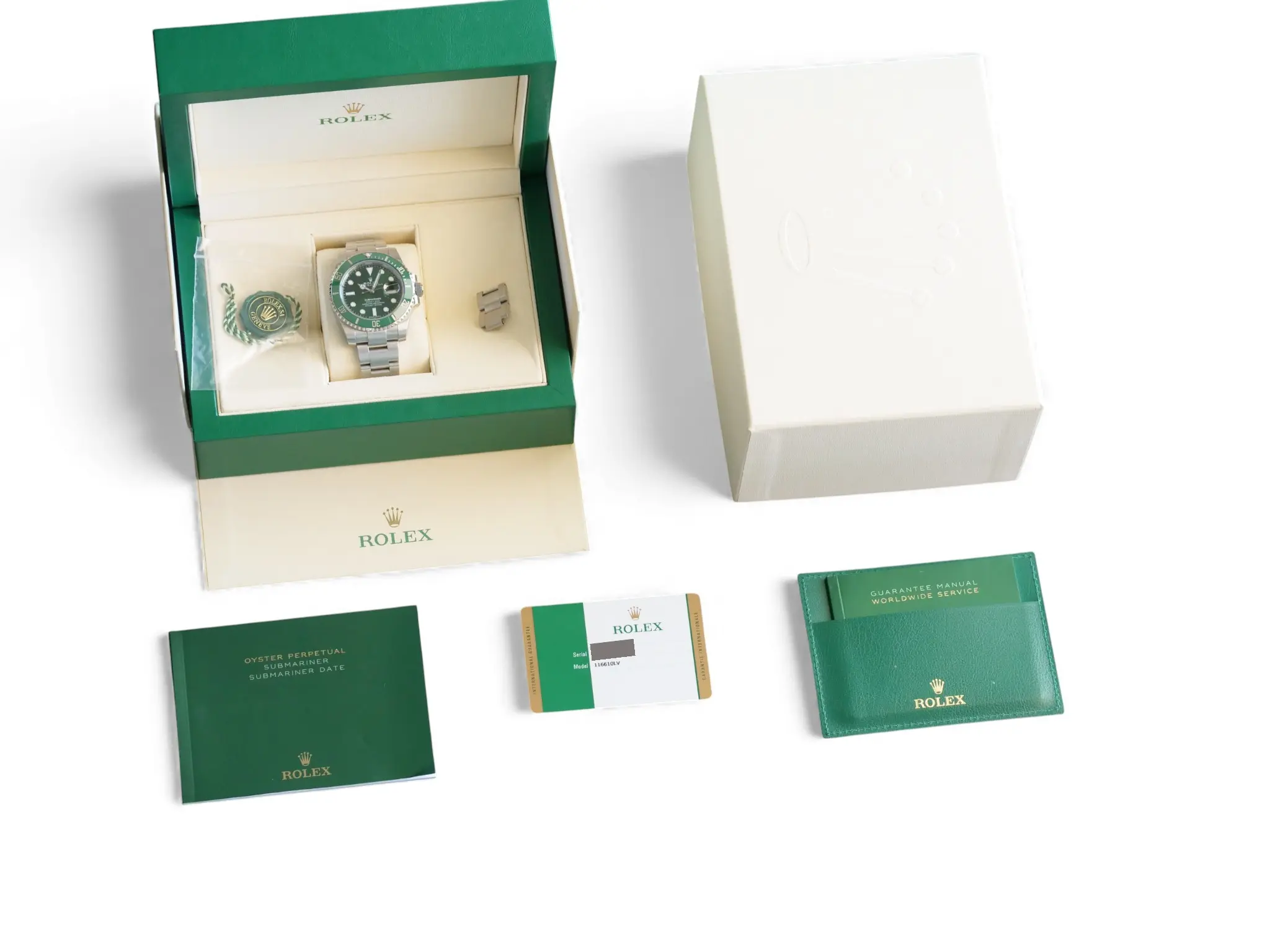 All photos on this listing are from the actual Rolex Submariner Hulk 116610LV timepiece for sale and are our intellectual property across all platforms. The serial number and the card details are redacted in all the photos for privacy and security reasons.