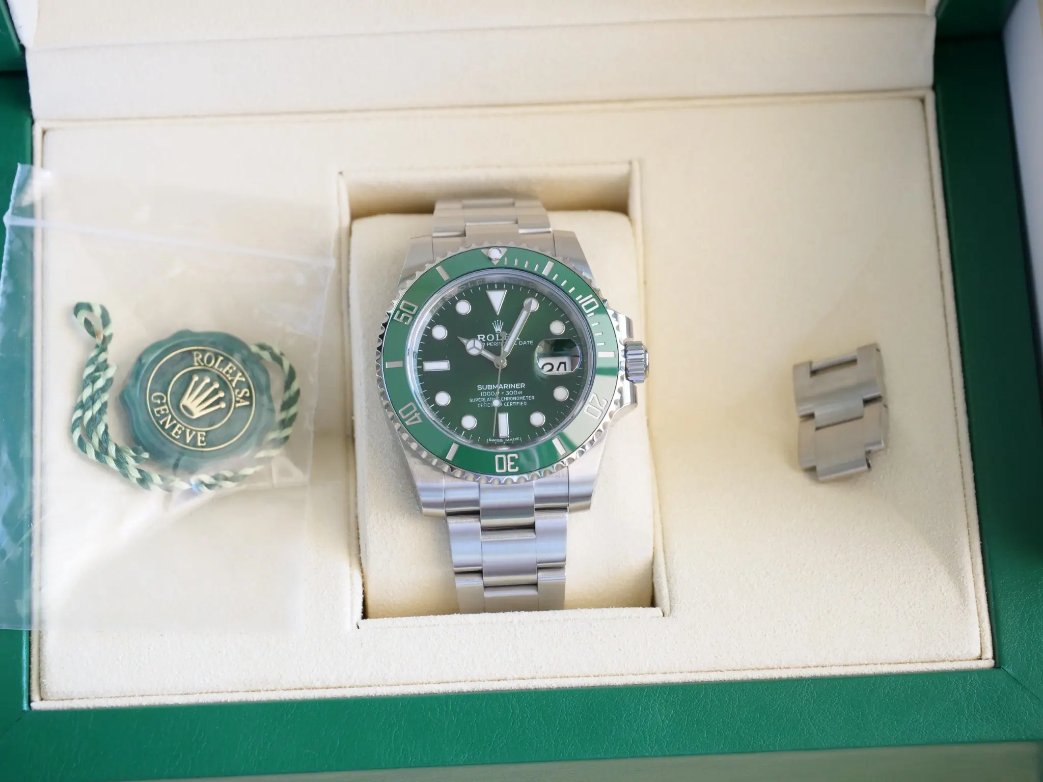 This particular example of Rolex Hulk is dated 2020, marking as one of the last ones produced by Rolex before this masterpiece was discontinued by Rolex (later in 2020) and comes as a complete set with boxes and papers, as shown in one of the photos.