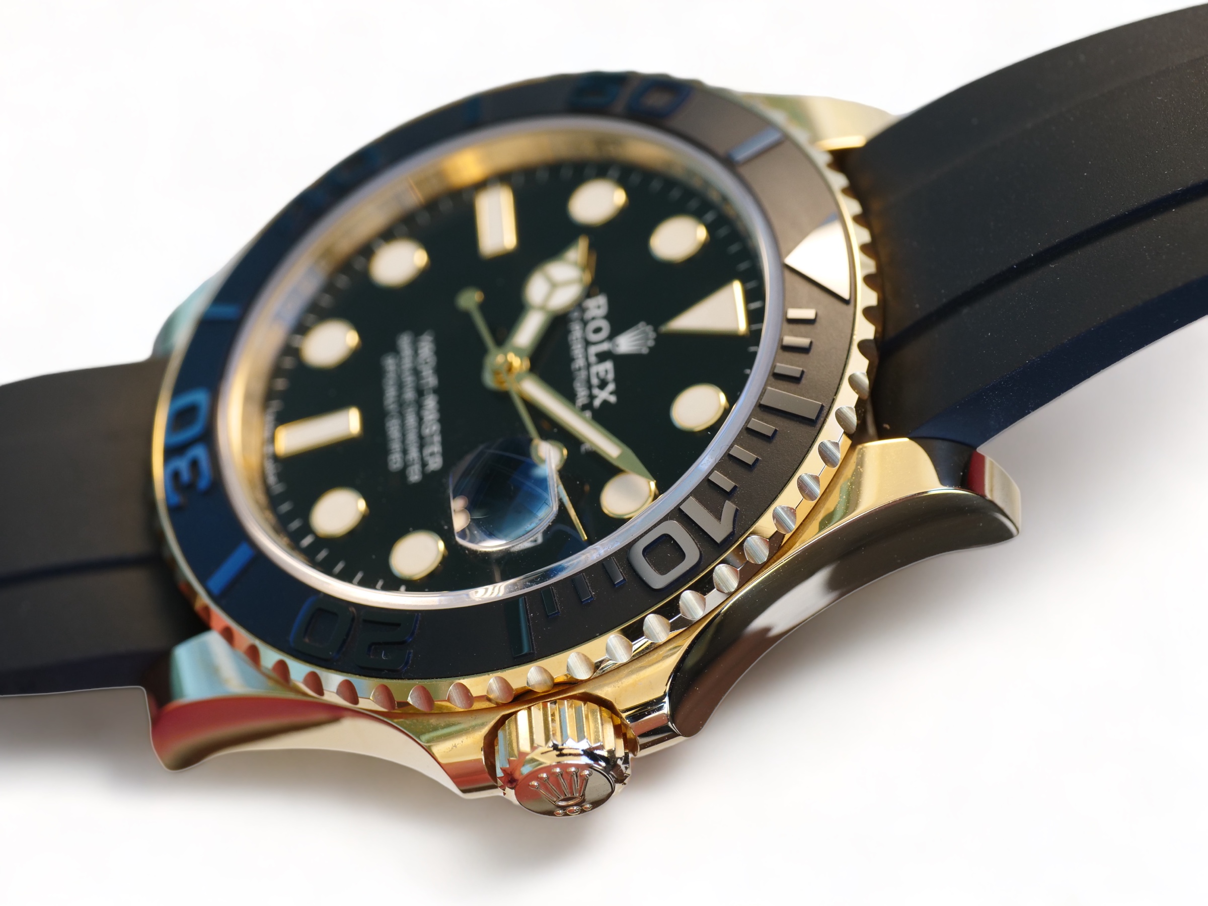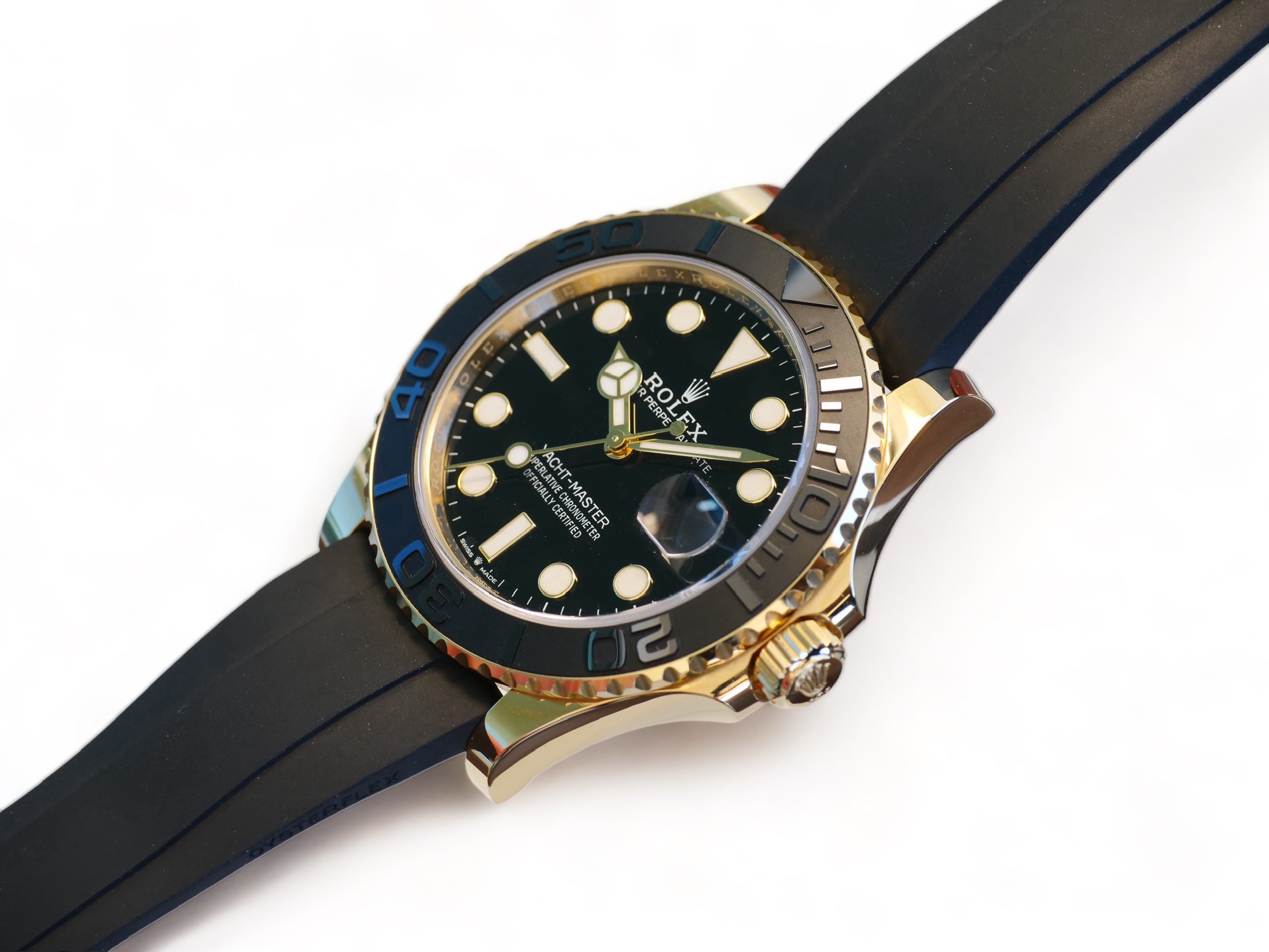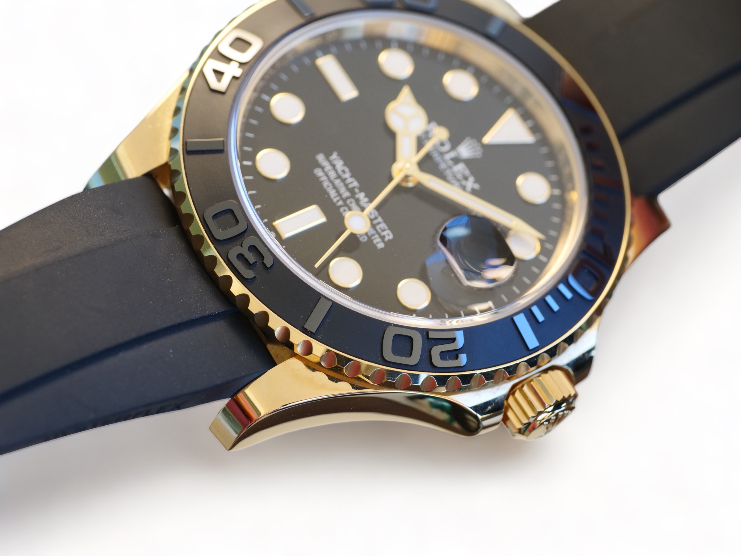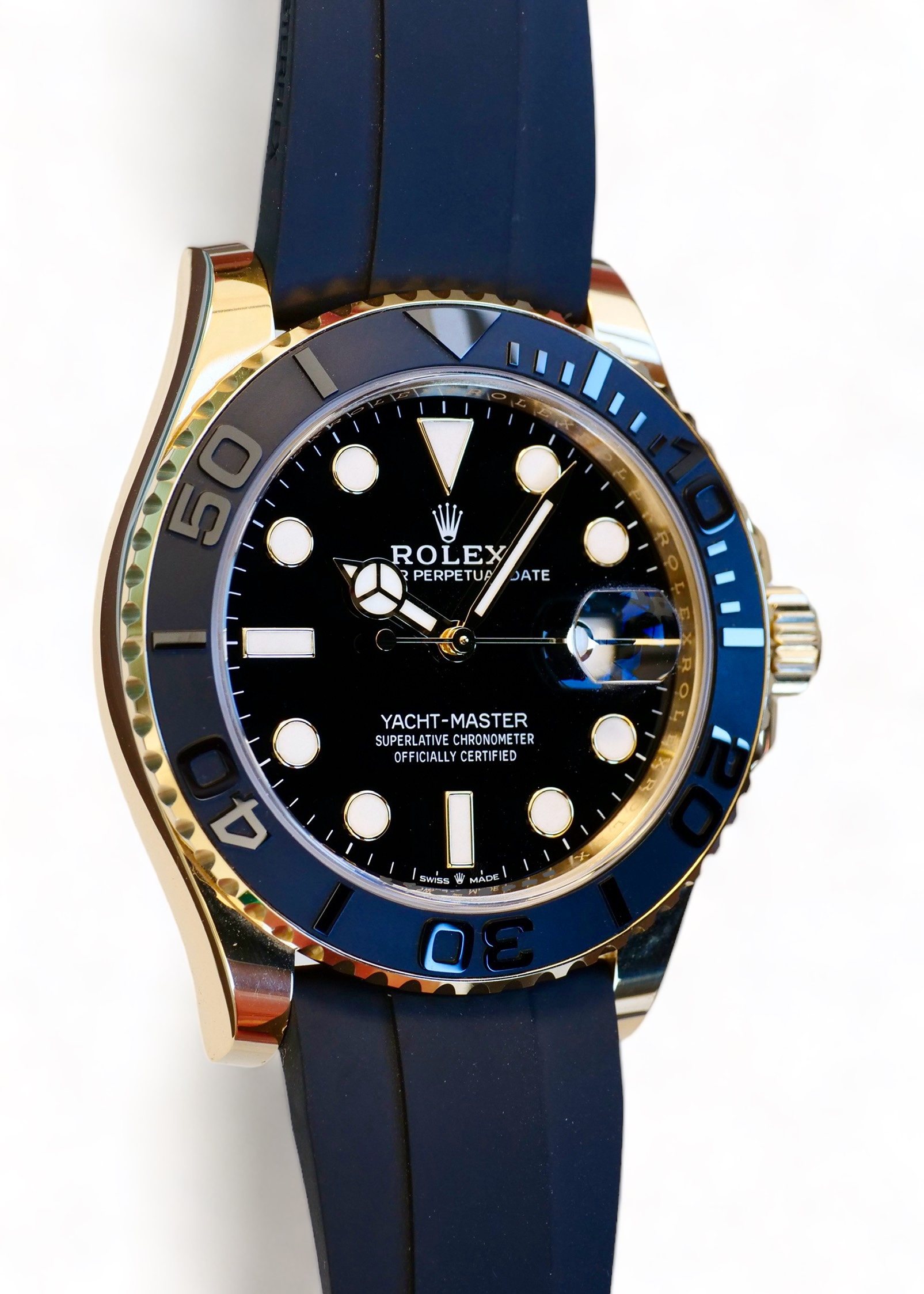 On offer for sale is a very beautiful Rolex Yachtmaster in 18ct Yellow gold, a modern 42mm case size with a ceramic bezel and, Oysterflex bracelet with folding Oysterlock safety clasp with Glidelock extension system.