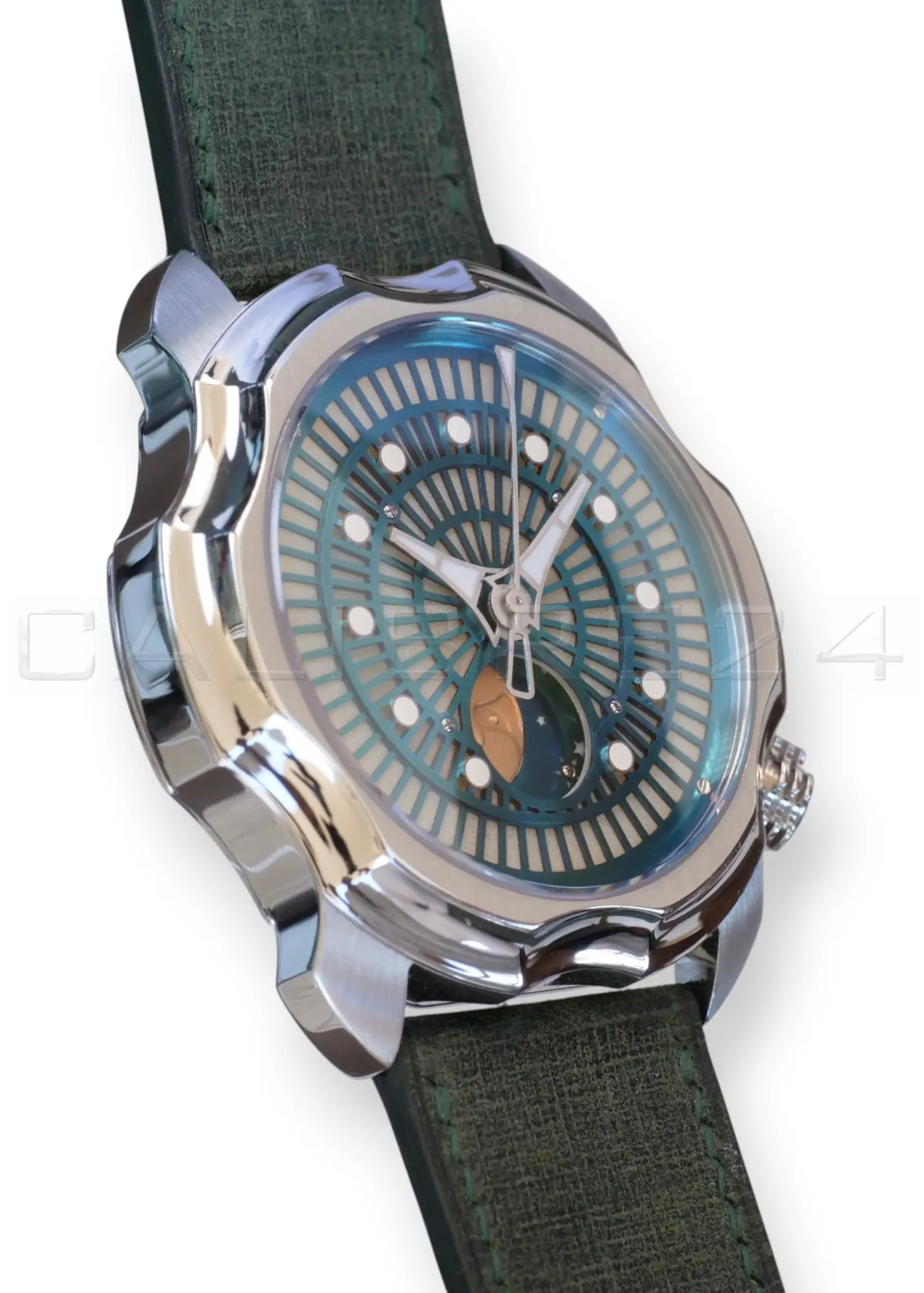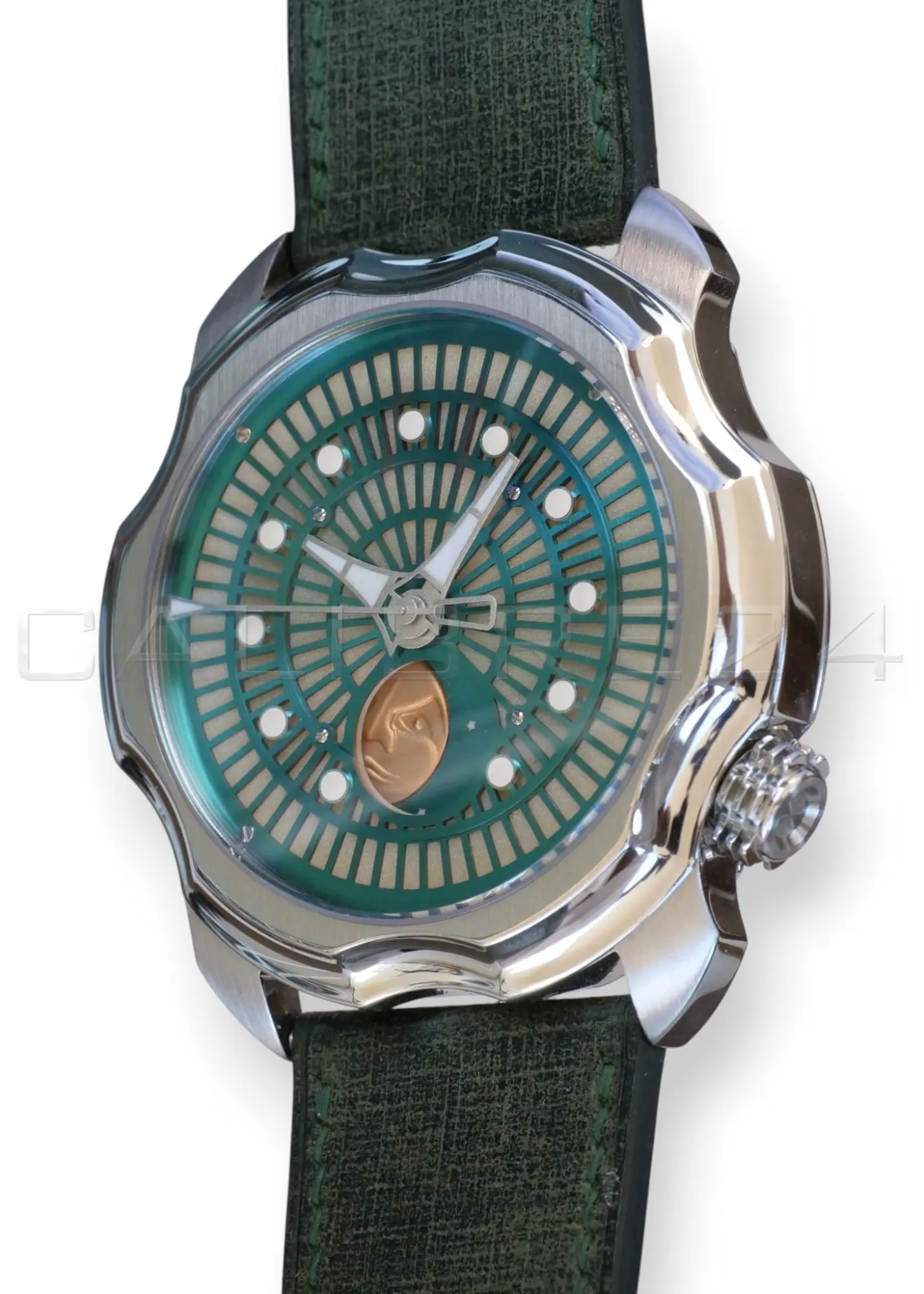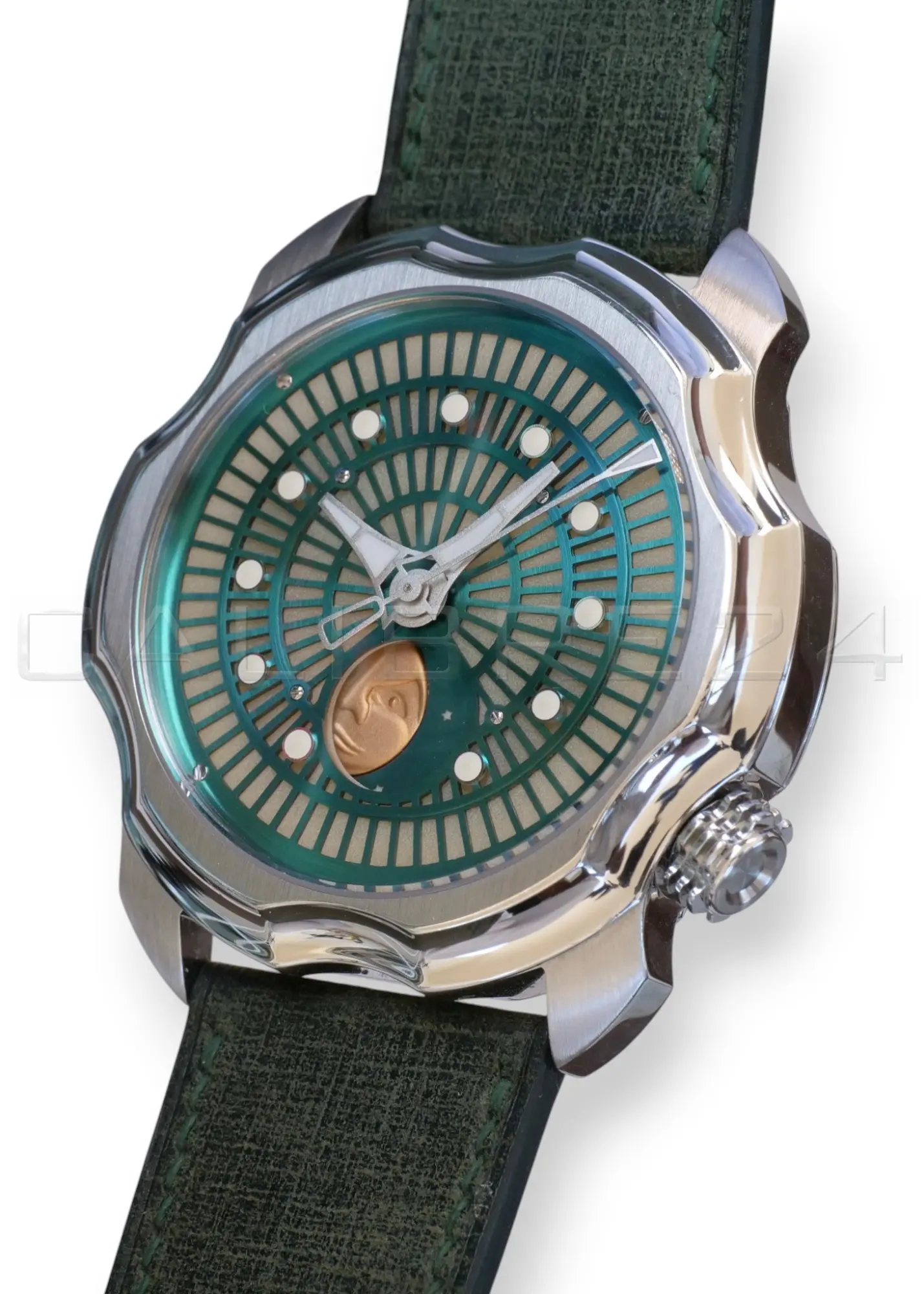 At Calibre24, we present one of the most distinctive and rare independent watch creations. This Sarpaneva K0 Korona Northern Lights Green Lume Dial, limited to just 8 pieces worldwide, is offered in mint condition, full set with box and papers dated 2016.