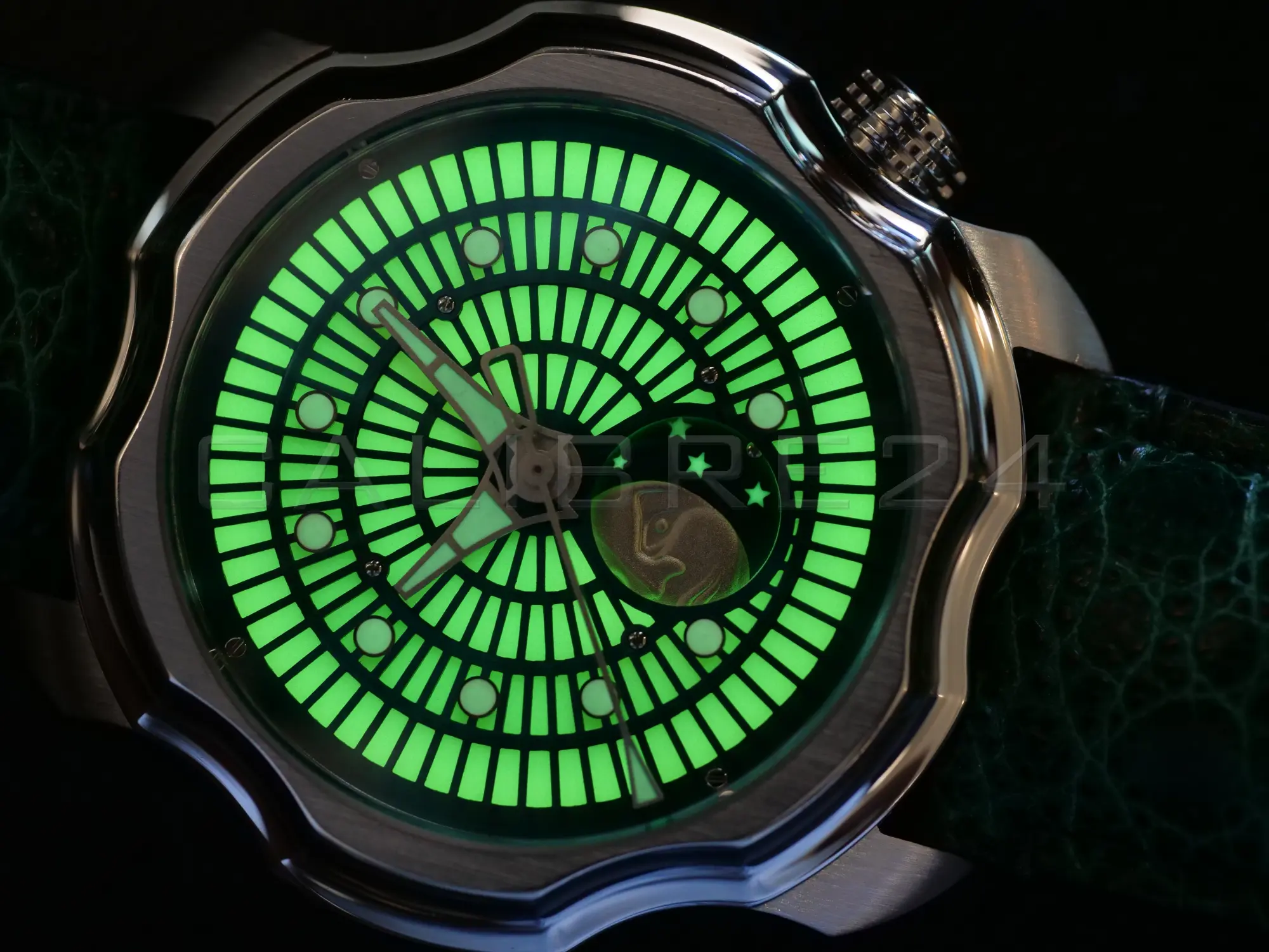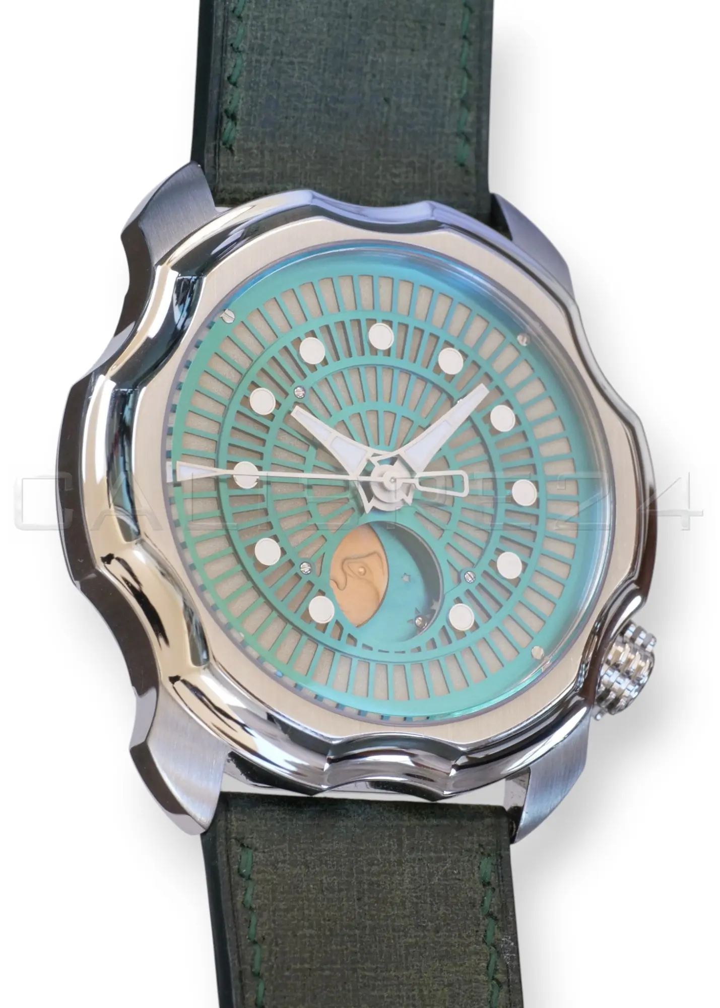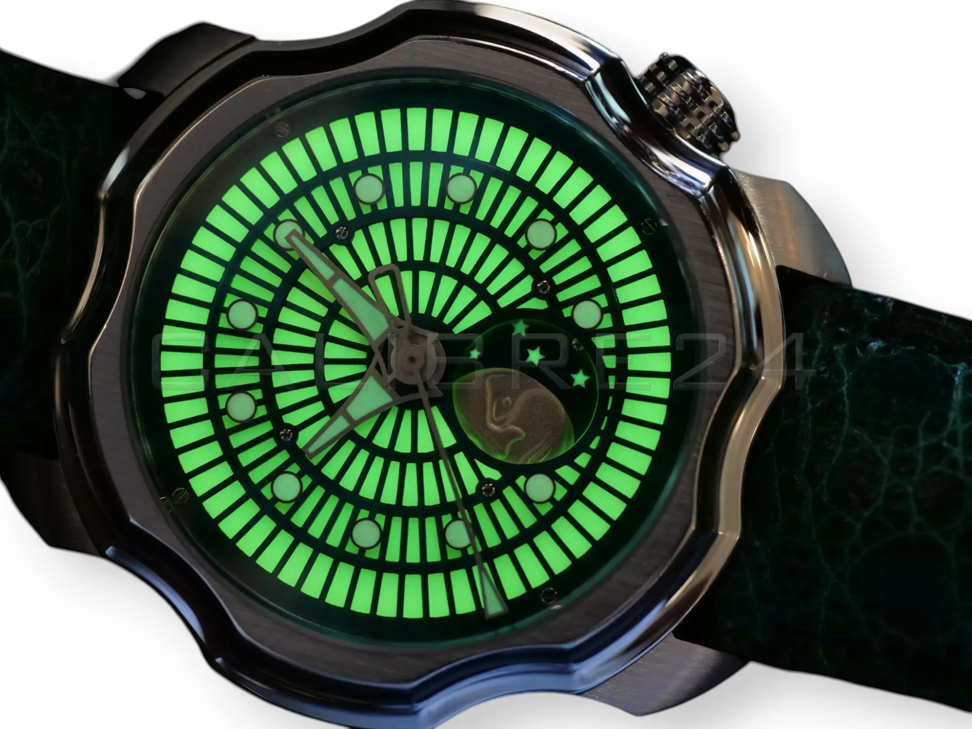 At Calibre24, we present one of the most distinctive and rare independent watch creations. This Sarpaneva K0 Korona Northern Lights Green Lume Dial, limited to just 8 pieces worldwide, is offered in mint condition, full set with box and papers dated 2016.