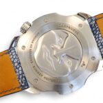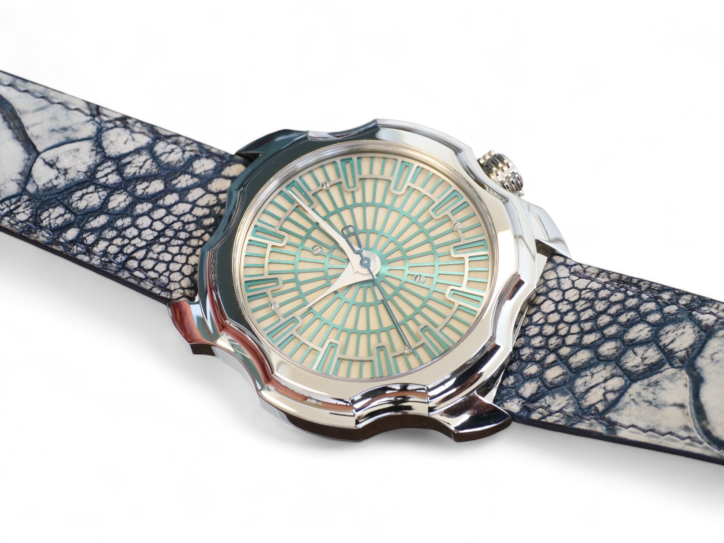 The Sarpaneva K0 Seasons Summer watch is presented in steel case with a highly polished Korona k0 case that houses a beautiful green coloured dial grill with a blue seconds hand. The watch comes in Mint and Like-new condition and is offered as watch only with original Sarpaneva tang buckle.