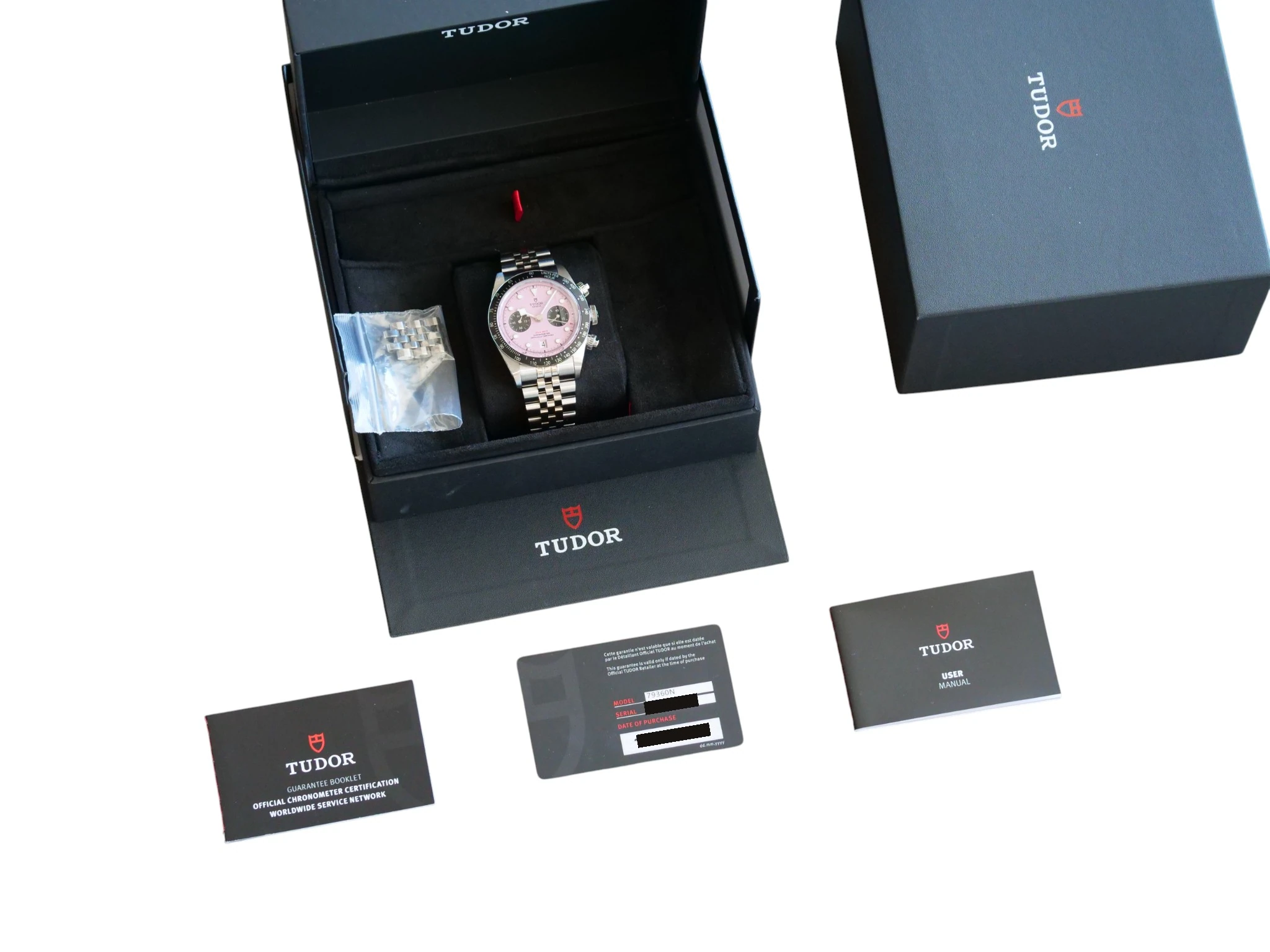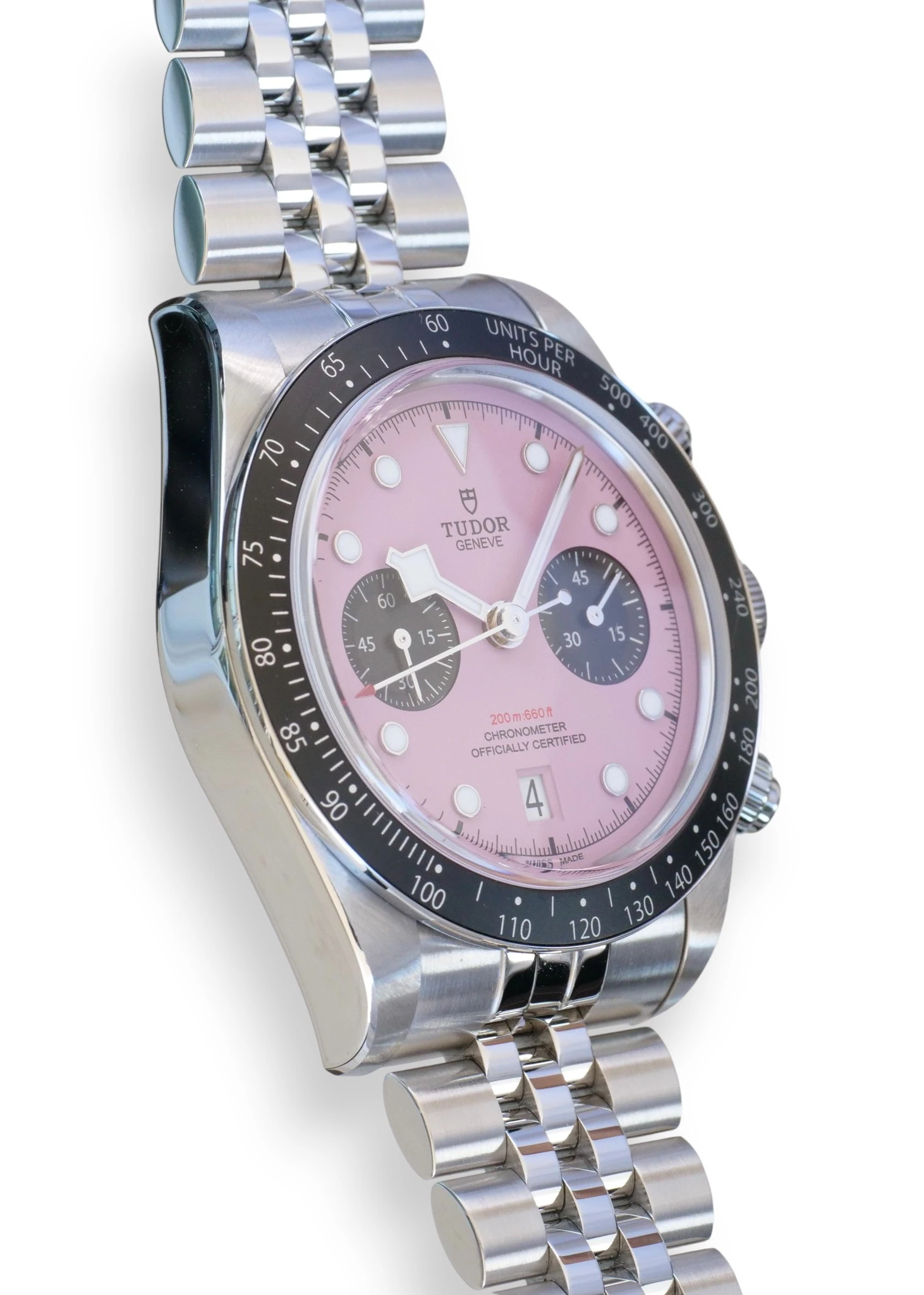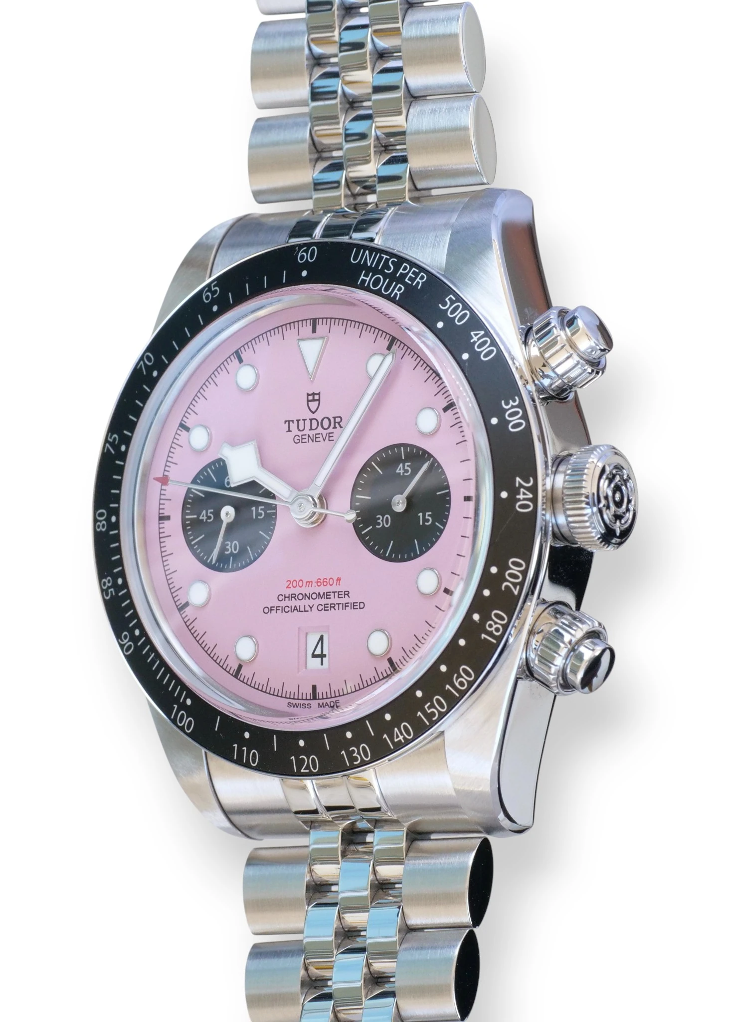 Please note that we don’t use catalog photos rather all the photos on this listing are taken from the actual Tudor Black Bay Chrono Pink Dial timepiece for sale and form part of description and condition disclosure. The photos showcase the very timepiece that is available for sale i.e. what you see is exactly what you will receive, shall you wish to purchase this timepiece.