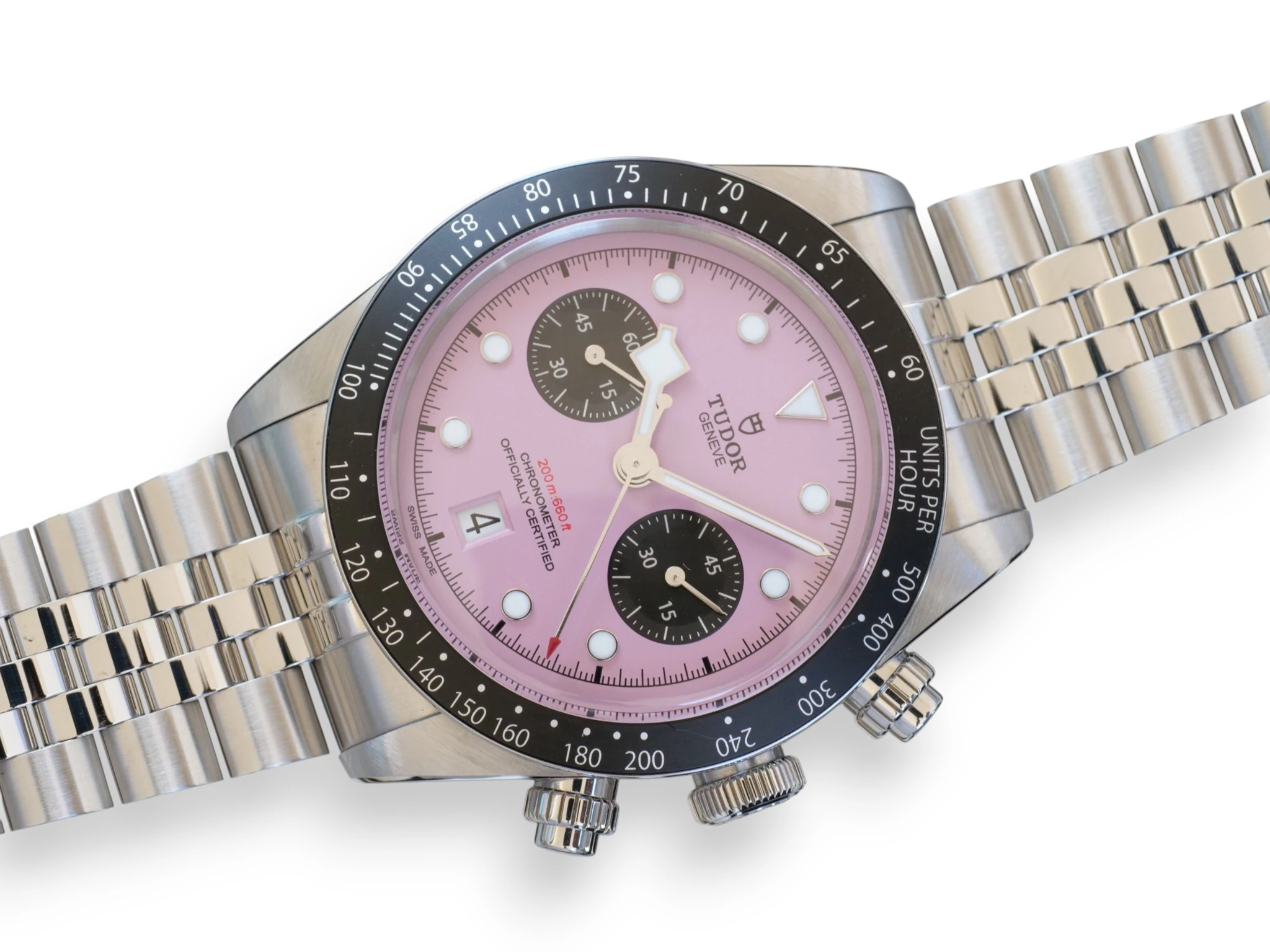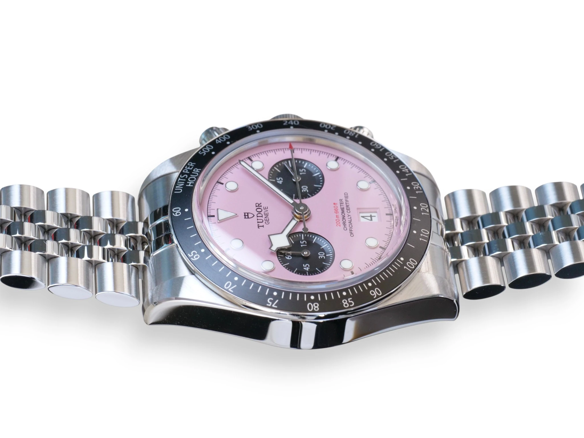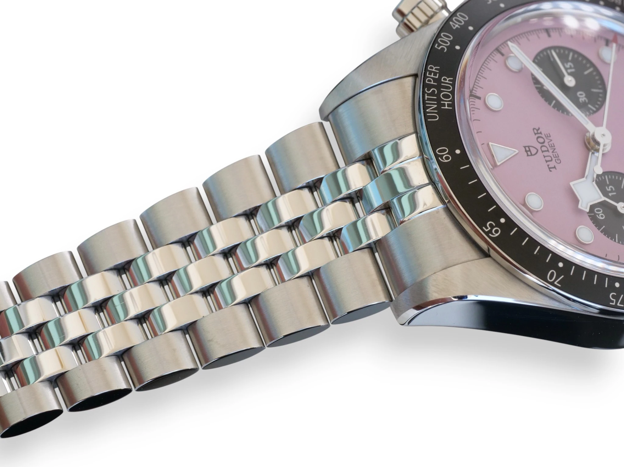 Tudor Black Bay Chrono, in a very popular and uber-cool Miami Pink Dial, reference M79360N-0019, complemented further with the 5-link bracelet with polished and satin-brushed finishes, with TUDOR “T-fit” rapid adjustment clasp.