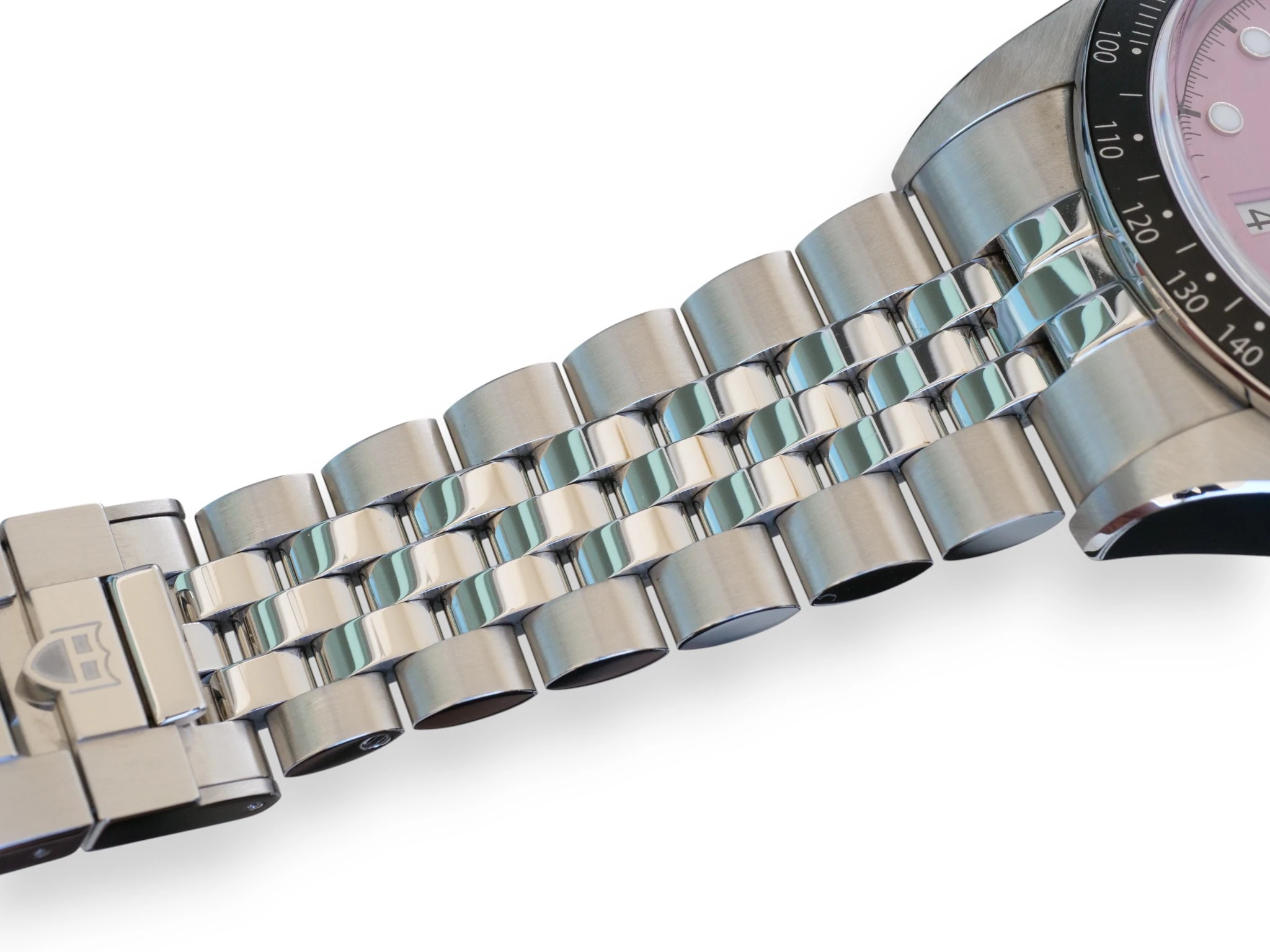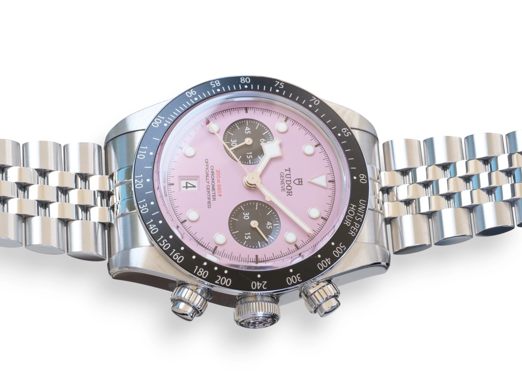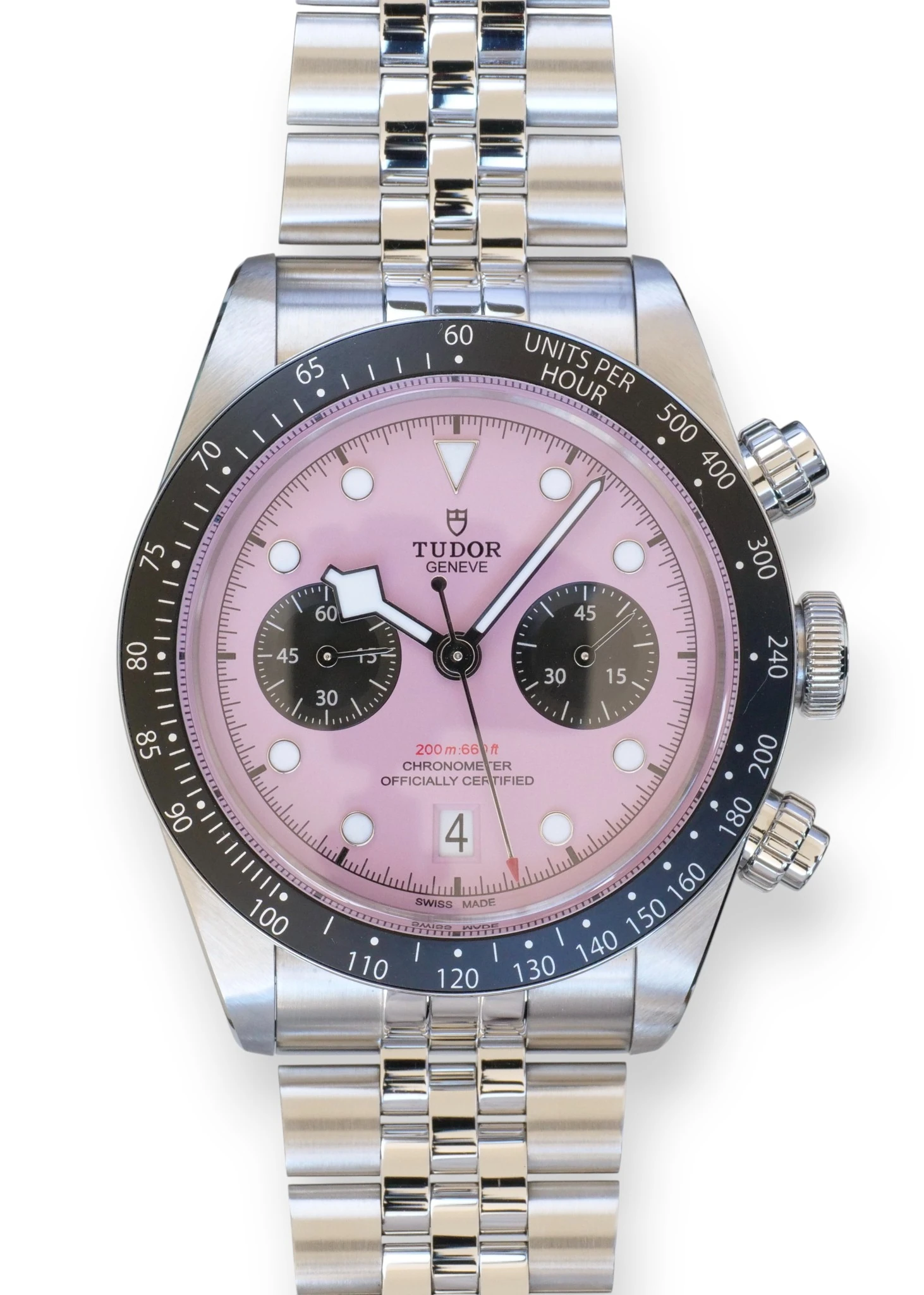 Tudor Black Bay Chrono, in a very popular and uber-cool Miami Pink Dial, reference M79360N-0019, complemented further with the 5-link bracelet with polished and satin-brushed finishes, with TUDOR “T-fit” rapid adjustment clasp.