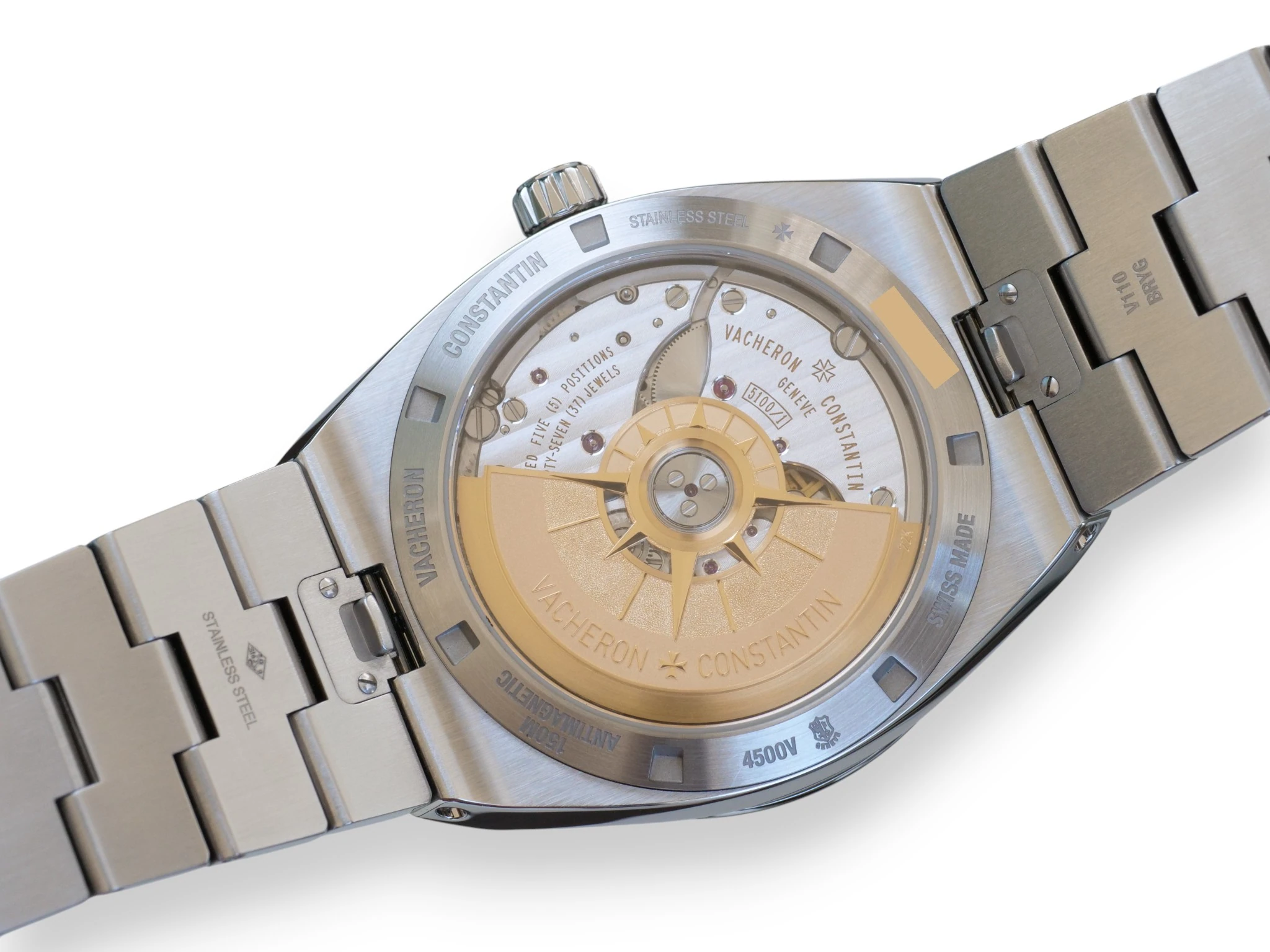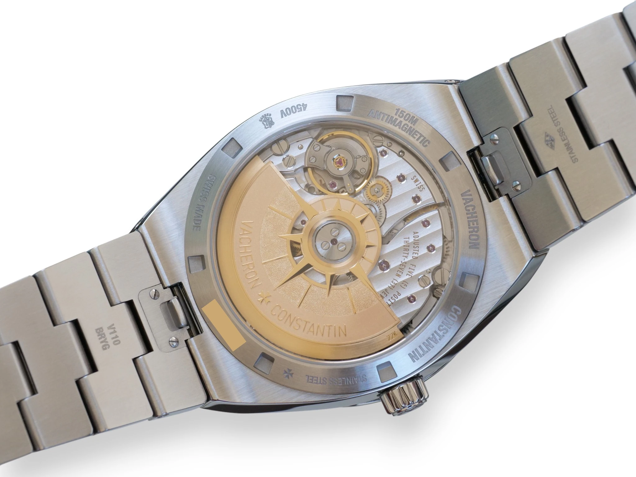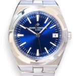 The watch features quick bracelet release system and comes with original Vacheron straps in blue rubber and blue alligator leather, integrated-clasp micro extensions, and a stunning 22K gold rotor showcases inside the see-through exhibition caseback.